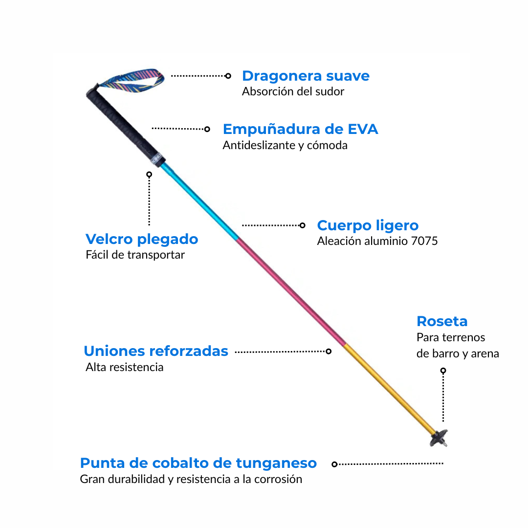 🌟 ¡Tecnología de punta y resistencia en cada paso! Fabricados con aluminio ultralight 7075 y un refuerzo de fibra de carbono, estos bastones te ofrecen una combinación única de ligereza y durabilidad para enfrentarte a los terrenos más desafiantes sin comprometer tu rendimiento. ¡Ideal para los amantes de la aventura! 🚶♂️💨